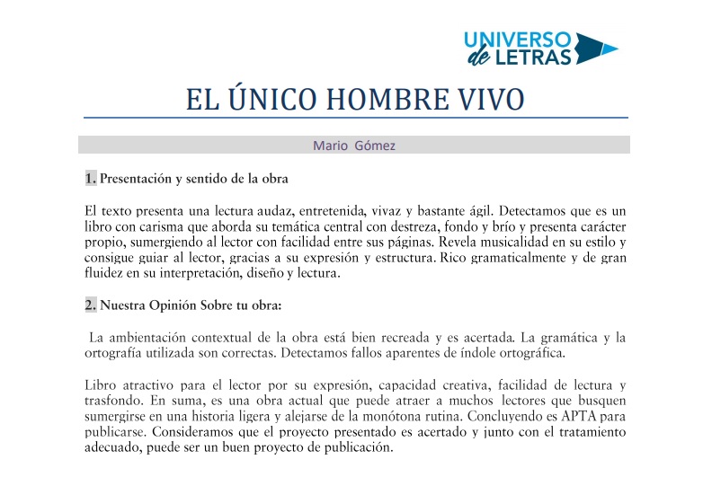 Comparto con orgullo la primera opinión de la obra «El único hombre vivo». Que fue la que se hizo justo al terminar el manuscrito y entregarlo a la Editorial. Sabía desde el primer momento que la obra iba a gustar pero no esperaba una crítica y una valoración inicial tan positiva. Las faltas de ortografía, obviamente, ya se corrigieron en uno de los procesos de la publicación. Ahora esta listo para ser leído.